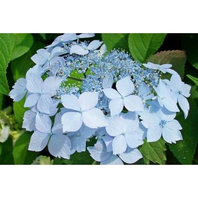 Цветение начинается в июле и продолжается до августа, иногда затягиваясь до сентября. Соцветия имеют щитковидную форму, могут быть плоскими или слегка выпуклыми, достигая диаметра 15-20 см. Цветки формируются на побегах прошлого года, при этом центральные цветки могут быть белыми, розовыми или голубыми, а основной оттенок — голубой. Способность цветков менять свой цвет в зависимости от типа почвы делает этот сорт поистине уникальным.